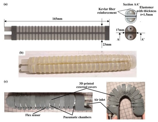 One of the most crucial elements for SEGs is the utilization of soft actuators due to the fact that they perform the necessary movement in the SEG configuration. For the purposes of this work, a previously developed soft robotic actuator was utilized based on research from a previous study [28]. In that research, the processes of design, development, and fabrication were presented in-depth. More specifically, the employed actuator is a soft actuator fabricated with silicone rubber compound and reinforced with Kevlar fiber. Moreover, the kinematics of this actuator was designed to imitate the locomotion of earthworms, such as Lumbricus Terrestris [29,30,31]. Thus, it has a double half-tubular structure configuration, which enables a potential angular range from −180 to 180 degrees (extension to flexion). Furthermore, the overall structure of the actuator was developed to be comparable to an average human finger in terms of dimensions and offer multiple degrees of freedom (DoF) in order to reproduce the physical movement of a human finger (i.e., two DoF for the thumb and three DoF for the rest). However, the comprehensive advantage of this actuator is the modular 3D-printed external cover. To elaborate, the soft actuators were assembled with 3D-printed rings constructed by rigid polymer (i.e., PA12), enhancing the structural integrity of the object and allowing the free extension/flexion motion of the actuator. Moreover, the existence of the rings could offer physical constraints to avoid the undesired angles depending on the rings’ geometry and reinforce the safety of the SEG. Finally, the last advantage of the proposed actuator is the integration of a one-axis soft flex sensor inside the actuator’s structure, providing real-time data for the motion and position of the actuator. The motion of the actuator is performed through the pressured air inside the half-tubular structures, with each structure inflated for each motion direction; for example, for bending movement, the upper half-tubular structure is inflated. Therefore, the actuator’s motion could be fully controllable with an electro-pneumatic control system. Figure 3a,b show the 3D design and physical model of the actuator’s silicone rubber double half-tubular core. Also, Figure 3c portrays the configuration of the developed actuator for the SEG application.