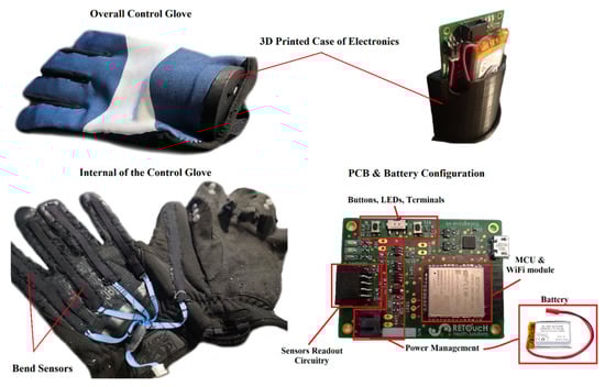 The control glove is an additional glove applied to the healthy hand, and its objective is to capture motion data in order to use it for the control/motion of the SEG. In the control glove, there are five one-axis soft flex sensors, namely the Bend Labs Digital Flex Sensor, one for each finger, in order to capture the finger’s motion. These bend sensors utilized the variable capacitance technology offering high accuracy and reliability with low power consumption. The other parts of the control glove are the controller configuration (PCB) and the battery. As is depicted in Figure 4, the PCB consists of the microcontroller (MCU) embedded with a WiFi module, the power management module, the sensors readout circuitry, other buttons, LEDs, and terminals. It is important to highlight that as MCU hardware, the module Esspresif ESP32-WROOM-32 was utilized. In addition, the control glove was designed to operate autonomously in terms of power due to the existence of a Lithium Polymer (LiPo) battery. Figure 4 shows the overall configuration of the control glove and its components.
