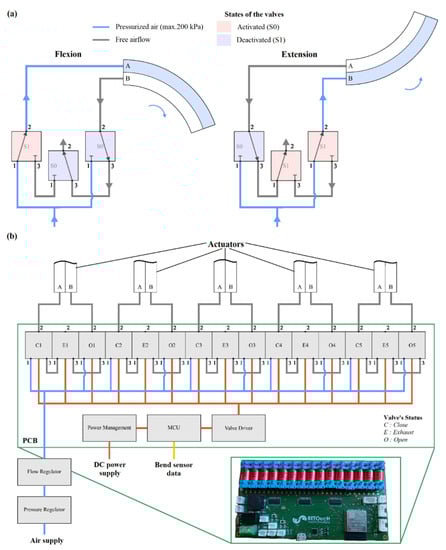 (a) Illustration of flexion (left side) and extension (right side) of a single actuator coupled with the schematic diagram of the pneumatic circuit; (b) Overall pneumatic circuit coupled with the PCB configuration.