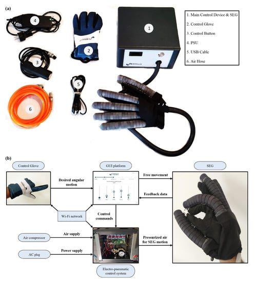 In this sub-section, the final design of the overall SEG device is presented, coupled with its components and main technical characteristics. In detail, as is depicted in Figure 8a, the SEG device consists of the main control device and the SEG (1), the control glove (2), the control button (3), the power supply unit (PSU) of the device (4), the USB cable (5), and the air hose (6). Furthermore, Figure 8b shows an illustrative flowchart of the SEG device function. In addition, Table 1 lists the main technical characteristics of the device. It is worth noting that the SEG, along with the main control device, weighs 2.5 kg and the control glove has a mass of 0.1 kg leading to an overall weight of 2.6 kg for the whole SEG device.