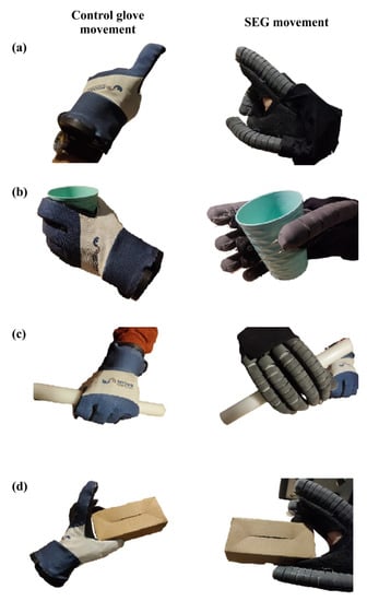 Indicative images of hand movements with the SEG and control glove. (a) Finger exercises; Holding exercises of (b) cup; (c) pipe; (d) box.