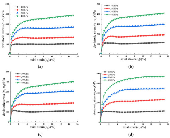 - When the axial strain is small, the stress–strain relationship curves of the plain soil and the coir fiber-reinforced red clay are consistent, indicating that the reinforcement effect is not obvious at this time. With the increase in axial strain, the occlusal friction between the soil and the fiber and the tensile resistance of the fiber gradually play a role, which improves the shear strength of the soil and increases the deviatoric stress of different samples.
