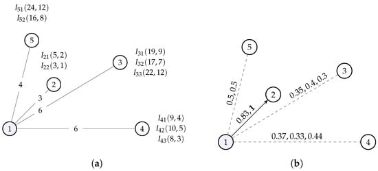 Figure 1 shows an example of the process followed by the city selection heuristic. In this case, we have an instance with five cities and a total of ten items (Figure 1a). Moreover, we must decide on the first stop on our tour. Since there are four available paths, the heuristic computes the profit over the weight ratio of each candidate item (those that can be picked up) at each unvisited city. Then, these ratios are divided by the length of the corresponding path, yielding a score metric. The path that holds the best score is finally selected. In our example, this corresponds to city number 2, as indicated in Figure 1b by the value in bold.