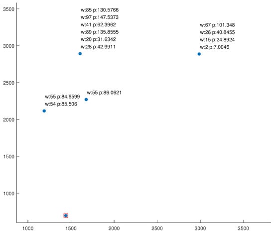As in the TSP, the problem formulation considers a set of T cities where the information about the distance between each pair of cities () is contained within a known matrix . Moreover, every city i contains a finite set of items , where can vary from one city to the next, and each item has a profit and a weight , . For the sake of simplicity, we define as the maximum number of items from at least one city; this quantity is obviously linked with the knapsack problem. Thus, it is straightforward to introduce the matrices and containing the profits and weights, respectively, for each item from any city; . Moreover, let us say that we currently have a tour of ordered cities where each city in the tour represents one of the cities available in the TTP instance since . In this way, represents the starting city, and is the next city that will be visited (), even if it is not the closest one or does not represent the second city in the problem instance. Hence, and . Now, we can lay out a profit function by incorporating a binary matrix representing the packing plan for each city. Recall that each element from this matrix becomes one if an object k is taken from city i and is zero otherwise.