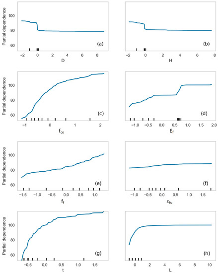 The partial dependence plot given in Figure 2 expresses the average marginal effect on the compressive strength when each one of the eight input variables changes, while, in parallel, the remaining inputs are fixed. It is observed that the effect of fco on fcc is crucial, since, if all other inputs remain constant, as fco spans from its minimum to its maximum value, fcc is significantly altered (Figure 2c). Similar fcc behavior is acquired for the t parameter (Figure 2g). These two parameters denote that the unconfined concrete strength and the FRP thickness, i.e., the main structural components of the specimen, mostly characterize the compressive strength. The number of FRP layers, L, seems important only for the first layers, while its increase after a certain value does not provide extra strength (Figure 2h). Geometrical characteristics D and H, (Figure 2a,b, respectively) are only negatively affecting fcc when they have small values (i.e., small specimens), while this effect is no longer valid for larger specimens. FRP elastic modulus, Ef, and tensile strength, ff, are two features that have an important impact on fcc, as can be seen from the respective Figure 2d,e. On the other hand, fcc is only slightly affected by the change of the FRP ultimate tensile strain, εfu (Figure 2f).