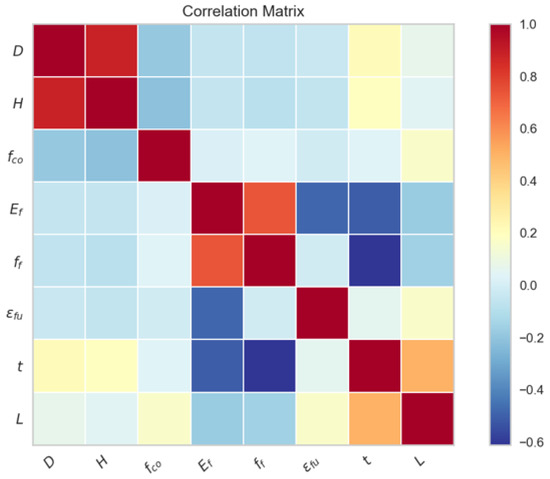 and, next, a correlation test is applied for all input features to check for independency. Figure 3 is the correlation matrix, which depicts the correlation coefficients between input variables. Values range from −1 to 1, where −1 indicates a strong negative correlation, 0 indicates no correlation, and 1 indicates a strong positive correlation. If two variables are highly correlated (negatively or positively), it may be necessary to remove one of them from the model to avoid overfitting or to improve the model’s performance. It is observed that some kind of correlation exists between D and H, Ef and ff, and t and ff, though further investigation is needed to clear out if these input pairs may be omitted from the model.