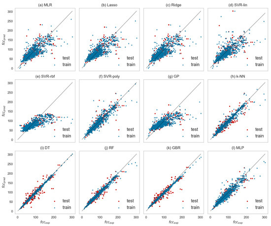 Experimental versus predicted values for fcc (both training and test data) in identity plots being the output of 12 different algorithms, (a) MLR, (b) LASSO, (c) Ridge, (d) SVR-linear kernel, (e) SVR-RBF, (f) SVR-polynomial, (g) GP, (h) k-NN, (i) DT, (j) RF, (k) GBR, and (l) MMLP. The 45° line shows the perfect match.