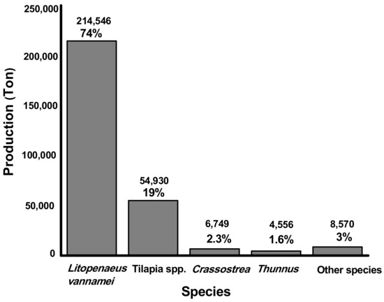 The main species cultivated in Mexico in aquaculture are shown (Figure 1), highlighting the production of Pacific white shrimp (Litopenaeus vannamei) followed by Tilapia spp. as the main species, with 74% and 19%, respectively. This highlights the relevance of working with them, since they represent the largest number of official aquaculture farms in the Registry of National Fisheries and Aquaculture (RNPA), with 4626 aquaculture facilities [18,19,20].
