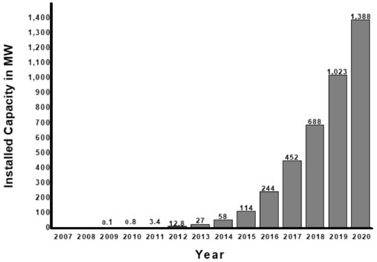 Since the publication of the first interconnection contract for small-scale solar energy sources, as well as the entry into operation of the first large-scale photovoltaic plant in 2011, the installed capacity of solar energy increased, and this increase has been reinforced by the significant growth of the linked interconnection contracts (small and medium scale), in which since 2011 (Figure 2) a significant growth up to 2020 of 1388 MW can be observed [30].