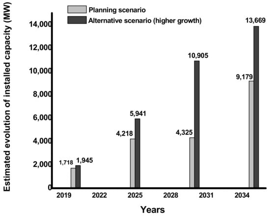 In Figure 3, estimates are shown made by SENER (Ministry of Energy) and CRE (Energy Regulatory Commission), where it is projected to install between 9179 and 13,869 MW by 2035, distributed generation solar photovoltaic systems [30,31].