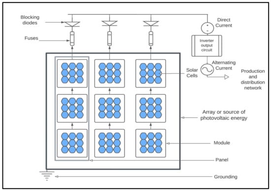 Photovoltaic systems are formed by several elements to be defined [34], firstly the Photovoltaic Cell, which is the smallest semiconductor element capable of converting sunlight into electrical energy via direct current; secondly a Photovoltaic Array (PVA) consisting of a circuit formed by several branches of photovoltaic modules connected in parallel. With these elements of energy source the construction of a Photovoltaic Generator (PVG) is possible, defined as a generating unit capable of converting incident solar radiation directly into electrical energy in the form of direct current. It consists of the electrical and mechanical integration of the following components, as shown in (Figure 4).
