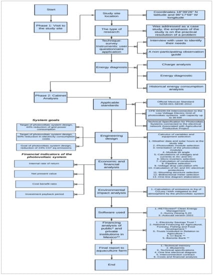 The technical data collection was carried out following the recommendations previously suggested for the On Grid-PV design [74] that were adapted for the study site; Figure 7 shows the phases applied during the research and their considerations, both in the field phase (1) and in the office phase (2). A non-participant observation guide and a survey with open-ended questions were used as field tools to develop the energy diagnosis.