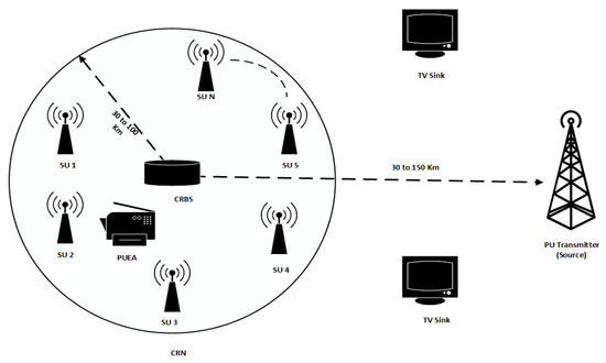 The proposed approach in this paper comprises a CRN with a central point called Cognitive Radio Base Station (CRBS) and randomly deployed N SUs. Along with the CRN, there is a PU set-up that consists of a PU transmitter and many fixed receivers. In our model, the PU transmitter is called the source, and the receivers are TV sinks. The PU transmitter is the source that wants to send signals for communication with TV sinks. CRBS has all the information regarding the PU transmitter, as it is the licensed sender. The diagrammatical representation is shown in Figure 1. The positions of the PU transmitter and SUs are known to the CRBS. The distance of the PU transmitter ranges from 30 km to 100 km. The PU is placed at a certain position outside the CRN.