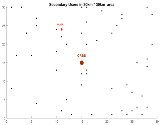 Figure 1 shows the proposed system design, which consists of a CRN with a PU transmitter and TV sinks, a CRBS, randomly deployed SUs, and a PUEA. The radius of CRN ranges from 30 km to 100 km. The main components of the system are PUs, SUs, and PUEAs. The PU is considered to be fixed and located outside the network at a distance of 30 km to 100 km. The PU is licensed and has a high priority for transmitting using the band. SUs are not licensed and use the PU only when it is free. The PUEA does not interfere with the PU, but it destroys the spectrum and damages the spectrum sensing process of the system; in this way, the spectrum remains unused by the SUs when there is no transmission from the PUs. The PUEA can capture the PU signal, imitate it, and recommunicate its very peculiar sign, having attributes similar to the PU sign, to cheat the SUs.