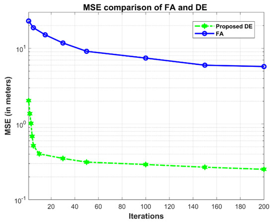 It shows that increment in the iteration number increases the localization precision. The number of SUs remains 50 for this simulation. The MSE of DE decreases with the increase in the iteration number as shown in Figure 5. Between 0 and 10 iterations, the localization error decreases, and convergence occurs faster and is supposed to be a predictable behavior. From iteration 10 to 30, the error decreases a little bit, and the plot for DE is nearly constant. When the iteration increases from 30 up to 100, the MSE value remains constant. Above 100, the MSE decreases further, but it does not touch 0, as the predictable values used for DE are not true. For FA, the MSE is a constant value above 150 iterations. It is clear from Figure 4 that the proposed DE approach is performing better than the FA.
