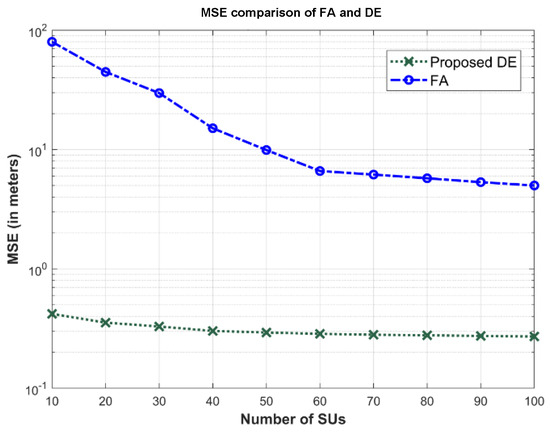The deviation in MSE with the increment in SNR is shown in Figure 6. The SNR values increase from −10 dB to 30 dB where the SUs remain at 50. It is obvious from Figure 6 that DE has better performance than FA. The results show that, as the SNR values increase, the MSE declines rapidly for DE and slowly for FA. For FA, when the SNR ranges between 10 dB and 20 dB, the MSE remains constant and decreases further until 30 dB SNR. The MSE for DE declines with the increment in SNR until it reaches 30 dB. This decline in MSE shows that the proposed DE model is close to the estimated position of the attacker, as a lower MSE normally specifies an enhanced approximation.