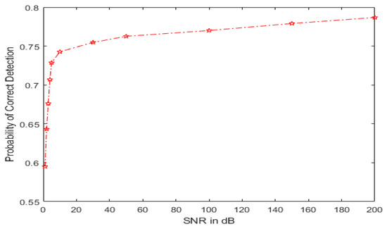 The effect of changing the SNR value on the correct detection probability is shown in Figure 8. It is obvious from the graph that as the SNR increases, the likelihood for the correct detection of the PU also increases. This shows that the performance of the proposed technique is good with varying SNR. The SNR ranges from 0 dB to 200 dB, and SUs are 50.