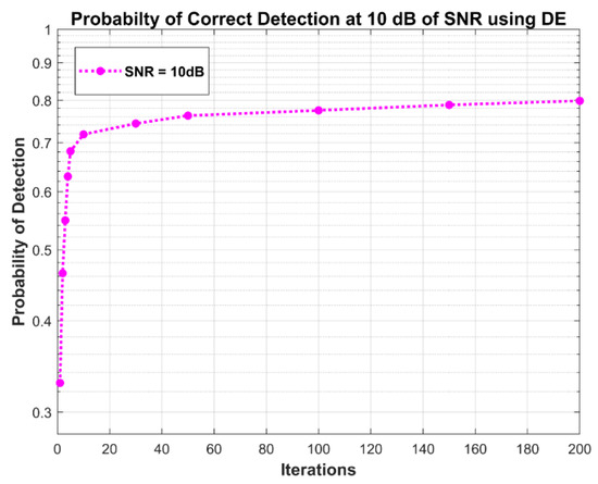 The probability of correct detection with varying iterations at 10 dB SNR.