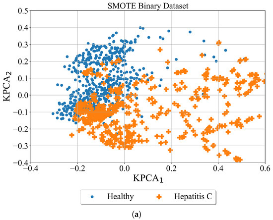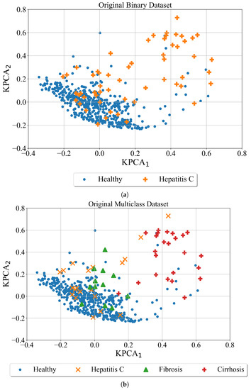 In Figure 6 the results of SMOTE over-sampling technique to both binary and multi-class datasets are shown. As seen in the binary case the minority class (Hepatitis-C) is oversampled. The region of this class is now much larger although both classes overlap. In the case of the multiclass problem, three minority classes (Hepatitis C, fibrosis, and cirrhosis) are oversampled. The number of samples is much larger than in binary case and the overlapping occurs between all 4 classes.