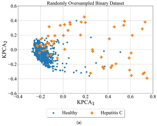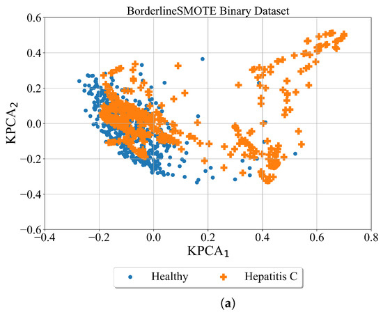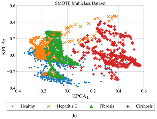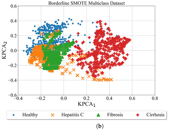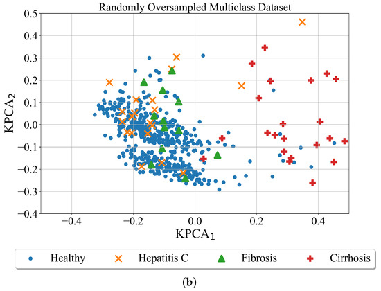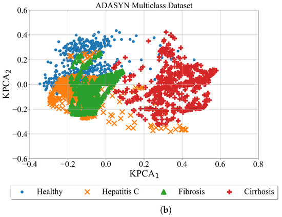 After the minority classes are oversampled in both cases using the ADASYN method the kernel PCA was utilized for better dataset visualization. The results are shown in Figure 7.