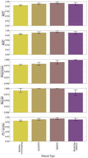 The graphical representation of mean values of ACC, AUC, precision, recall, F1-Score with standard deviation.