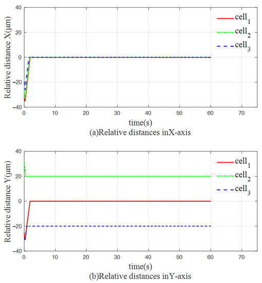 In reality, the cell’s environment might change. For example, changes in the coefficient of viscous resistance will cause changes in the stress of cells. Therefore, according to Table 1, the value of β/k is changed to 0.09 for the experiment. In order to further verify the robustness of the cell cooperative controller based on FBELNN proposed in this paper, the expected trajectory was changed at the same time, and the expected spacing matrix of each yeast cell in the triangle formation was set, . All other experimental parameters remained unchanged.