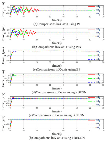 Figure 12 and Figure 13 show the trajectory errors in the X-axis direction and the Y-axis direction when using different controllers for multi-cell manipulation. It can be clearly seen that the three cells have different trajectory errors during the manipulation control process. When the PI and PID controllers are used, the trajectory errors of the three yeast cells in both directions shake violently before convergence. The farther the initial position of the cells is from the expected trajectory, the slower the trajectory error converges. At the same time, large errors tend to increase the collision risk of multi-cell cooperative control and reduce the control efficiency. When BP, RBFNN, and FCMNN are used as controllers, the errors of the three cells in the X-axis direction and the Y-axis direction can quickly converge to near 0, but as the trajectory changes, the error will still fluctuate near 0. The cell cooperative controller based on the FBELNN proposed in this paper can move multiple cells to the desired trajectory at a faster speed than the above-mentioned controller, and the error convergence speed is extremely fast, which provides the safety of the cell cooperative control. It can complete the cell cooperative control task well and form the expected desired formation.