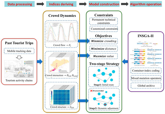Tourism activities essentially represent the interaction between crowds and attractions. Thus, crowd dynamics are critical to the quality of the tourism experience in personalized tour recommendations. In order to generate dynamic, personalized tour routes, this paper develops a tourist trip design problem with crowd dynamics (TTDP-CD), which is quantified with the crowd dynamics indicators derived from mobile tracking data in terms of crowd flow, crowd interaction, and crowd structure. TTDP-CD attempts to minimize the perceived crowding and maximize the assessed value of destinations while minimizing the total distance and proposes a two-stage route strategy of “global optimization first, local update later” to deal with the sudden increase in crowding in realistic scenarios. An evolutionary algorithm is extended with container-index coding, mixed mutation operators, and a global archive to create a personalized day tour route at the urban scale. To corroborate the performance of this approach, a case study was carried out in Dalian, China. The results demonstrate that the suggested method outperforms previous approaches, such as NSGA-II, MOPSO, MOACO, and WSM, in terms of performance and solution quality and decreases real-time crowding by an average of 7%.