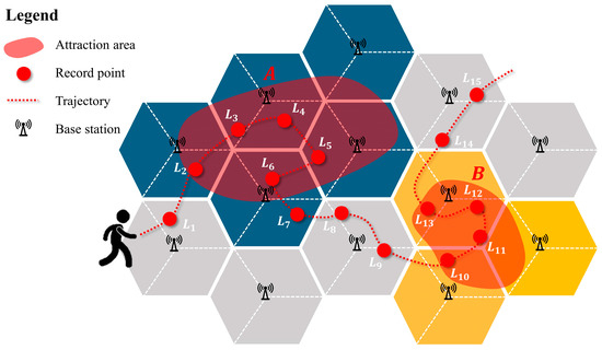 The broad coverage and low acquisition cost of mobile tracking data allow for an accurate description of tourism activities from individual and group perspectives [56]. As depicted in Figure 2, a user’s travel trajectory is recorded as the cell phone signal communicates with the base station. With the correspondence between the attraction area and base station location determined, the user’s stay within the attractions can be detected. Our goal is to identify tourists’ stays at multiple attractions within the city, thereby constituting complete tourism activity chains. First, the raw mobile tracking data needs to be preprocessed. Second, generate the stay sequences in attractions with mobile tracking data. Lastly, identify tourists with a filtering strategy based on the tourists’ spatiotemporal behaviors and generate tourism activity chains. Any users who meet the following spatiotemporal behaviors criteria are detected as tourists: (1) users who access the attraction area during the opening hours and spend more than 30 min there; (2) users who stay overnight (0 A.M. to 6 A.M.) at the same attraction or visit the attraction three or more times in a single day are judged to be the residents in the attraction area, not tourists; (3) users who stay at the same attraction during the daytime (8 A.M. to 7 P.M.) with several staying days more than half of the days of interest are judged to be commuters in the attraction area, not tourists.