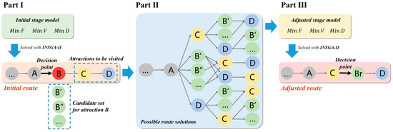 Finally, the optimal adjusted route is determined using the adjusted-stage model and the multi-objective optimization algorithm. The to-visit attractions include attractions C and D from the initial route and an alternate attraction, B. Furthermore, the next segment of transfer will also become the decision point for the next dynamic adjustment.