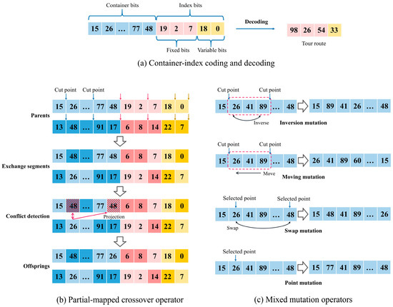 Representation of the chromosome and evolutionary operators: (a) container-index coding and decoding; (b) partial-mapped crossover operator; (c) mixed mutation operators.