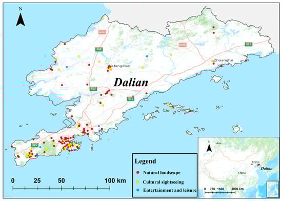 Dalian, located at the southern end of the Liaodong Peninsula, is one of China’s most popular coastal tourist supercities, with more than seven million permanent residents. It covers an area of 12,574 square kilometers and has a long coastline, stretching for thousands of kilometers, creating numerous sea-viewing spots. Dalian has witnessed most of China’s modern history and has various historical attractions. Figure 5 depicts the distribution of 151 major tourism attractions in Dalian, most of which are concentrated in urban areas.