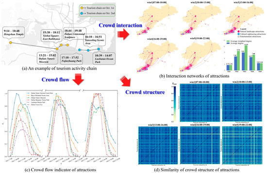 Derived results of crowd dynamics from tourism activity chains: (a) an example of tourism activity chain; (b) interaction network of attractions; (c) crowd flow indicator of attractions; (d) similarity of crowd structure of attractions.