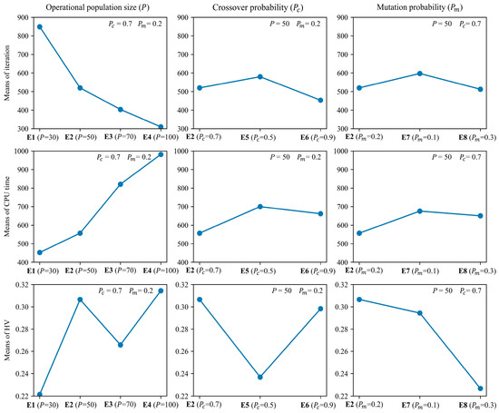Several parameters affect the performance of INSGA-II, including operational population size (), archival population size (), crossover probability (), mutation probability (), and maximum number of iterations (). In this paper, the value of is empirically set to 2000; is a multiple of set to ten times of . Eight sets of controlled trial experiments are designed to determine the appropriate values for the remaining parameters, including , , and . In Table 2, E1, E2, E3, and E4 are the experiments designed for the parameter , E2, E5, and E6 for parameter , and E2, E7, and E8 for parameter . Ten independent experiments are conducted for each set of parameters using the same dataset from Dalian.