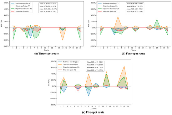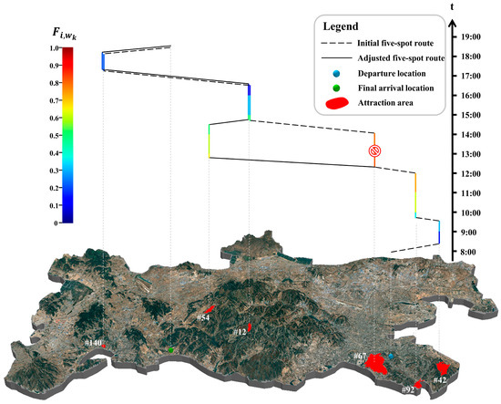 In Part III, the objectives of the adjusted stage model are identical to those of the initial route stage in Equations (12)–(14), while the mathematical models of the two stages vary in constraints. The change in the distance is inevitable after the adjustment, but an excessive increase in distance indicates a failed adjustment. Therefore, the constraint of the adjusted distance is determined by Equation (22), where and are the total route distances before and after the adjustment. Meanwhile, is the distance scaling factor related to the location distribution of attractions and the spatial scale of the city, which can refer to the distances of past tourist trips from mobile tracking data.