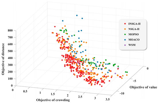 Better populations can be obtained by route evaluation with the archiving strategy. On the one hand, elite solution losses due to crossover and mutation operations are retained in the archival population, thereby reducing the risk of convergence distortion; on the other hand, preserving a larger archive population of non-dominated points entails preserving more information about the Pareto front accumulated during the last generations to guide population evolution.