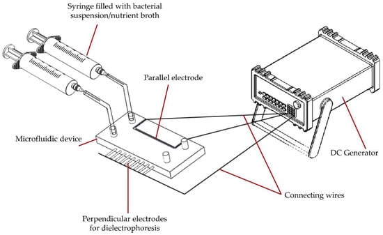 Schematic representation of the device setup, including a syringe pump, the syringes filled with bacterial suspension and nutrient broth, the microfluidic device with perpendicular and parallel electrodes, and the DC generator.