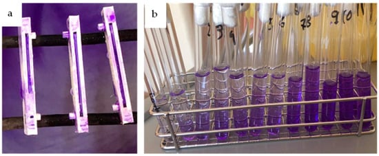 (a) Cut side of the microfluidic systems after the crystal violet staining; (b) Diluted solutions for UV-Vis investigation.