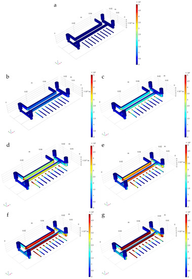 Electric field distribution (V/m) inside the microfluidic channels at (a) 0 V; (b) 10 V; (c) 20 V; (d) 30 V; (e) 40 V; (f) 50 V; and (g) 60 V.