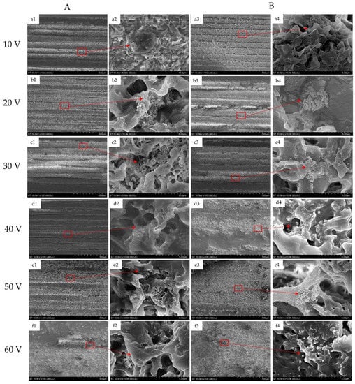 SEM images of the bacterial biofilms alongside (A) at 10 V ((a1)—×100; (a2)—×10,000); 20 V ((b1)—×100; (b2)—×10,000); 30 V ((c1)—×10; (c2)—×10,000); 40 V ((d1)—×100; (d2)—×10,000); 50 V ((e1)—×100; (e2)—×10,000); and 60 V ((f1)—×100; (f2)—×10,000); and side (B) at 10 V ((a3)—×100; (a4)—×10,000); 20 V ((b3)—×100; (b4)—×10,000); 30 V ((c3)—×100; (c4)—×10,000); 40 V ((d3)—×100; (d4)—×10,000); 50 V ((e3)—×100; (e4)—×10,000); and 60 V ((f3)—×100, (f4)—×10,000). The rectengular areas and the arrows correspond to the observation area in the ×100 magnification images.
