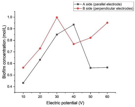 Another noticeable aspect is that above the electric potential of 40 V, the p-value is less than 0.05, indicating a statistically significant difference between the concentrations of biofilms along the two sides of the channel. This is a good indication of the fact that up to that electric potential value, the dielectrophoretic forces’ effect on the cells, however existent, is not as impactful as those above this value. Above 40 V, the effect of the dielectrophoretic forces increases, creating a greater difference in biofilm concentration between the two sides. For the side of the channel accommodating the parallel electrode above 50 V, the concentration of the biofilm seems to remain stationary, while the values of the concentration for the B side seem to decrease. This could be an indication of the decreasing distance between the high electric gradient regions along the main channel, as seen in the simulations.
