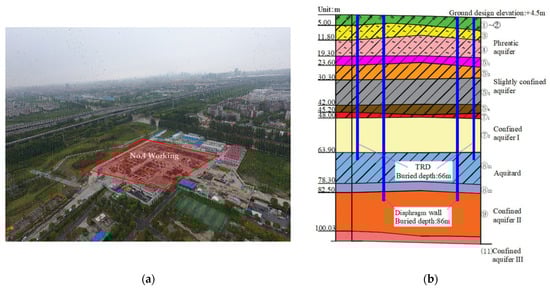 The foundation pit of the No. 4 working shaft of the Guanyuan project in the Pudong New Area of Shanghai was selected as the background. The foundation pit is located at Jihui Road, 97.1 m away from the West 220 kV high voltage tower, 12 m away from the east substation, and 8.5 m away from the pump house (Figure 1a). The size of the foundation pit is 55 m × 50 m, the ground elevation is 4.5 m, the excavation depth is 39.6 m. The foundation pit bottom is located in the silty clay of layer ⑤. The retaining system includes a diaphragm wall and a trench-cutting remixing deep wall, together with internal support. Dewatering, drainage, and water proof measures are adopted to control ground water. The surrounding environment of the foundation pit is complex and the dewatering subsidence has to be strictly controlled. The soil layer within 150 m depth of the site is composed of Quaternary Holocene to middle Pleistocene sedimentary strata. The strata are divided into 13 main engineering geological layers (Figure 1b):layers ①–②, layer ③, layer ④, layer ⑤1, layer ⑤2 (clayey silt with silty clay), layer ⑤3 (silty clay), layer ⑤4 (silty clay), layer ⑦1 (sandy silt), layer ⑦2 (silt), layer ⑧21 (interlayer of silty clay and silt), layer ⑧22 (silty sand with silty clay), layer ⑨ (silt), and layer (11) (silt). The aquifers consist of a phreatic aquifer (shallow soil layers), a slightly confined aquifer (layer ⑤,) confined aquifer I (layer ⑦), confined aquifer II (layer ⑨), and confined aquifer III (layer (11)). The stratum distribution and groundwater situation are shown in Figure 1b, and the corresponding parameters are shown in Figure 2. The water level of confined aquifer layer ⑦ is −1.40 to −2.64 m; the water level of confined aquifer layer ⑨ is −1.00 m; the water level of confined aquifer layer (11) is −2.15 m. The anti-gushing calculation of confined water and safe drawdown of layers ⑦, ⑧21, ⑨, and (11), according to the above water level, is shown in Table 1.