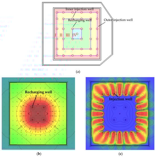 (1) The foundation pit was divided into several concentric ring areas and the recharging wells were installed along the separating lines, as shown in Figure 3a.