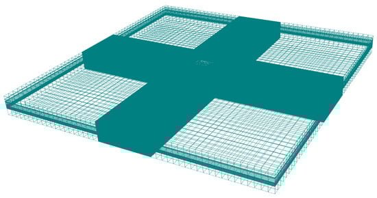 With the shaft foundation pit as the center, a modeling range of 2000 m × 2000 m and 150 m deep was selected. The range was generalized into a 3D heterogeneous, horizontally isotropic, and unstable groundwater seepage system. The model was divided into 10 layers according to soil layer distribution. The model divided the plane into 50 × 50 grids, and then each row and column of the grid within 3 times the width of the foundation pit were further refined into 40 copies (Figure 4). The ground elevation was +4.5 m. The outer boundary was defined as a constant water head boundary, and the bottom was set as an impermeable boundary. The model hierarchy and its parameters are shown in Table 2.