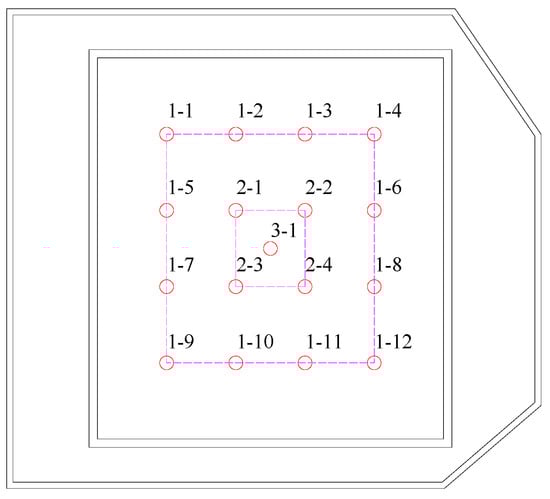 The design of condition 1 was conducted and used as a benchmark for comparative analysis with the subsequent conditions. In accordance with the field pumping test design, four dewatering wells were arranged. The dewatering wells on the horizontal plane are shown in Figure 6.