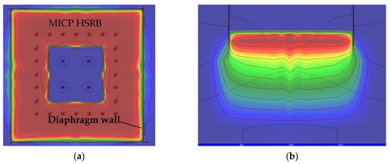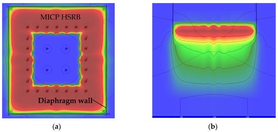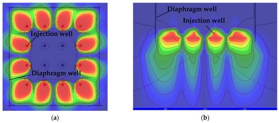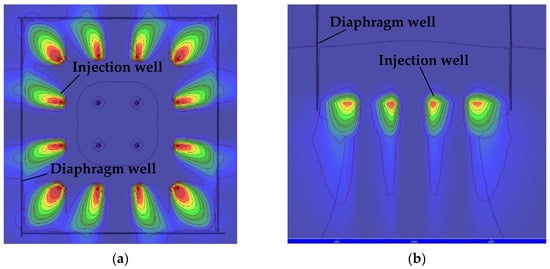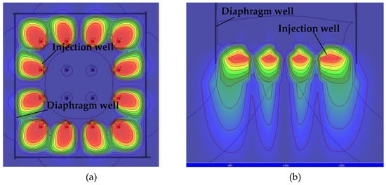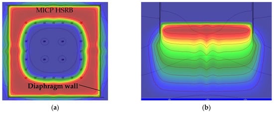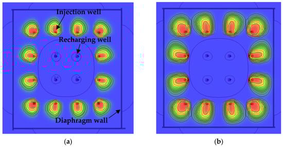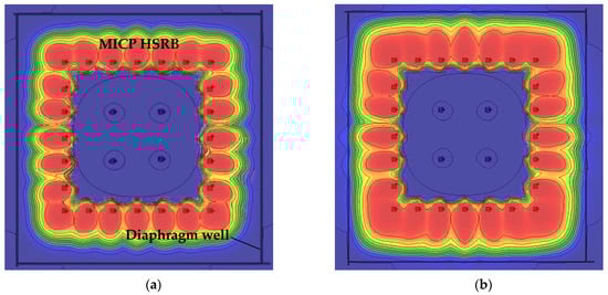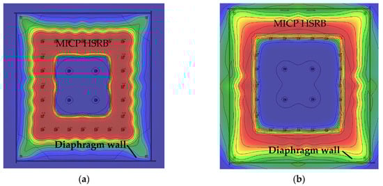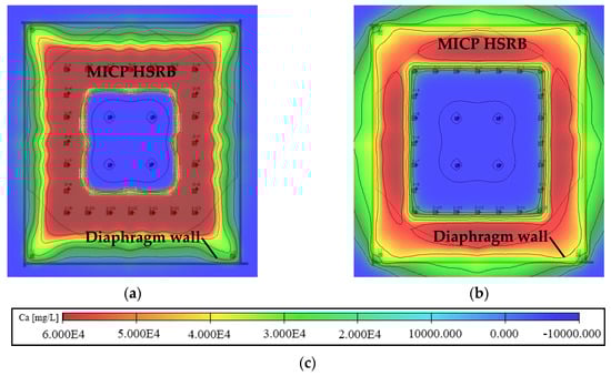 According to the analysis results of bacterial migration before, refer to the infusion plan of bacterial solution, bacteria solution (5000 mg/L, OD600 = 1) was injected at an irrigation rate of 400 m3/d after the stable seepage field was formed with an irrigation rate of 1000 m3/d in the recharging well. From the calculation results, as shown in Figure 25a, it was more difficult for the solution to migrate to the outer ring than to the inner ring after filling the pores with the calcium carbonate produced by the MICP reaction in the early stage. In order to solve this problem, and to minimize the re-addition of bacteria solution, the method of stopping the injection of bacteria solution into the outer ring and continuing the injection of water into the inner ring recharge wells at an irrigation rate of 1000 m3/d was adopted to promote the migration of existing bacteria solution outward. The calculation result is shown in Figure 25b. After the slurry injection is stopped, the seepage field formed by the inner ring recharge well continues to promote the migration of bacteria solution to the outside, enabling bacteria to break through the blocking effect caused by the carbonate generated in the earlier stage. However, this method will cause some bacteria solution to leak out, and it is necessary to replenish the bacteria solution.