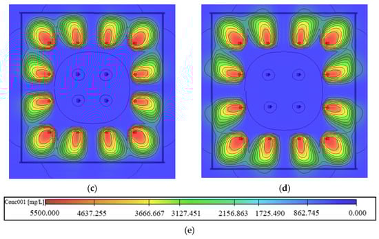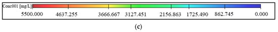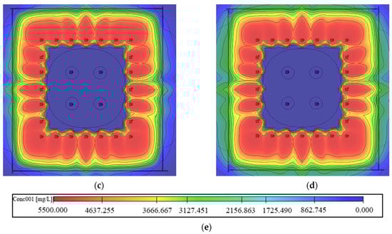 Figure 12 shows the migration of S. pasteurii after four days. Compared with working condition 1, increasing the recharging rate of the inner circle reinjection wells did not increase the migration coverage area of effective high concentration bacterial solution but did accelerate the bacterial solution leakage and reduced the effective concentration coverage area. Therefore, increasing the reinjection rate of the inner recharging well, which formed the seepage field, was inadvisable. It is necessary to further study the effect of the fluid injection rate on migration.