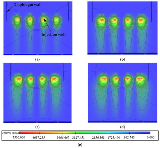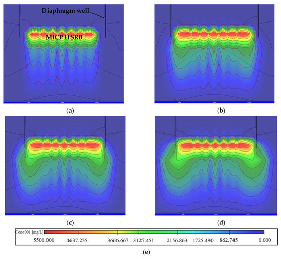The feasibility of migrating bacterial and cementing solutions to a confined aquifer via a recharge well had been preliminatively proved by simulation. The uneven distribution of the generated calcium carbonate was a problem that affected the integrability of MICP curing []. The reason was that bacterial cells had negative charges on their surfaces. Electrostatic forces between the cells repelled each other, but this negative charge attracted Ca2+ from the solution, which neutralized the charges and clumps together. The aggregated aggregates blocked the pores of the sand particles, which was not conducive to subsequent liquid transport, resulting in uneven calcium carbonate production throughout the sand column. Most MICP curing laboratory tests had noted the uneven distribution of carbonate deposition, mainly due to the plugging of perfusion points []. Through different grouting methods, the uniformity and distribution of calcium carbonate precipitation after MICP treatment could be changed, so as to change the strength and permeability of the soil after MICP treatment. The simplest grouting method was to inject the mixture of bacterial and cementation solution into the soil. However, this method easily caused the clogging of precipitated calcium carbonate crystals around the injection point and their non-uniform distributions over time, which blocked the channel, preventing the subsequent slurry from being injected into the soil. Thus, the spatial distribution of soil strength after MICP treatment was also highly non-uniform []. Whiffin et al. proposed a step-based grouting method []. After injecting a bacterial solution into the soil, it stood for a period of time so that bacteria could be absorbed on the surface of the soil particles before injecting the cementing solution. Compared with the mixed perfusion method, the sand porosity was obviously reduced, so as to improve the effect of improving permeability. On this basis, Harkes et al. improved the two-step grouting method []. After instillating a bacteria solution into soil for a period of time, a stationary solution (0.05mol/L, CaCl2 solution) was injected at a low speed to pretreat sand samples. On the basis of the two-step grouting method, a three-step grouting method was proposed. The stationary solution injection was added after bacterial solution injection and before cementation solution injection, which played a role in the uniform distribution of bacteria. This method increased the cementing length and significantly improved the plugging situation at the grouting mouth. However, when the MICP grouting technology was used to form the HSRB, the permeability of the sand layer under the action of MICP was gradually reduced, with the pores between the sand particles gradually filled by calcium carbonate precipitation. The sand layer needed to be injected several times over several days to achieve the designed hydraulic conductivity. With the MICP reaction of each solution in the previous MICP technology, calcium carbonate precipitation was generated, and the pores were filled gradually. Subsequently, the injection of bacteria solution, stationary solution, and cementation solution was hindered. In this simulation, the permeability and porosity of the model were changed to simulate the hindrance of solute migration in the later filling solution. In accordance with the test results of MICP reducing the permeability of sand, the hydraulic conductivity of the involved area was reduced in a corresponding proportion in the model, as shown in Table 7.