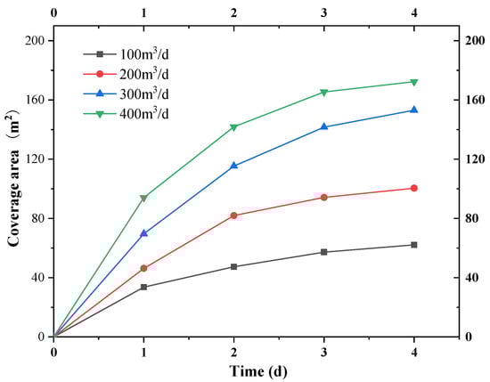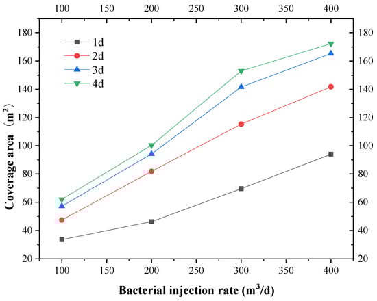 As shown in Figure 17, the higher the bacterial infusion rate, the larger the area covered by bacterial migration under the condition of the same continuous infusion time. No phenomenon occurred where the effect of increasing the coverage area decreased with an increase of time. The bacterial solution should be poured in as short of a time as possible to achieve the designed bacterial coverage area. The effect of 400 m3/d bacteria solution for 1 day was better than that of 200 m3/d bacteria solution for 2 days. Therefore, increasing the daily rate of bacterial solution was better than increasing the continuous time of bacterial solution when the total amount of bacterial solution is constant.