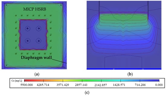 In accordance with the analysis results of bacterial migration and referring to the injection scheme of bacterial solution, 0.05 mol/L CaCl2 solution stationary solution with the irrigation rate of 400 m3/d was injected into the inner recharge well after the stable seepage field was formed by the inner circle reinjection well with an irrigation rate of 1000 m3/d. As shown in Figure 23, the stationary solution can easily reach the required area under the drive of the seepage field because the adsorption of Ca2+ on the silty fine sand of the layer in Shanghai is weaker than that on S. pasteurii. Therefore, the fixed solution can fully meet the design requirements after adjusting the scheme of the bacteria injection.